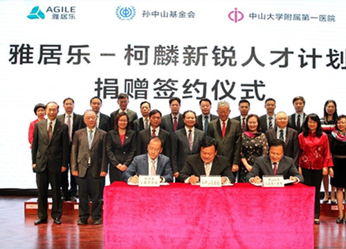 2017年,雅居乐在中山大学附属第一医院(以下简称“中山一院”),向中山大学捐赠一千万元人民币,设立“中山大学-雅居乐慈善发展基金”。同时通过孙中山基金会,向中山一院捐赠五千万元人民币,推行“雅居乐—柯麟新锐人才计划”,助力高水平人才引进和培养。